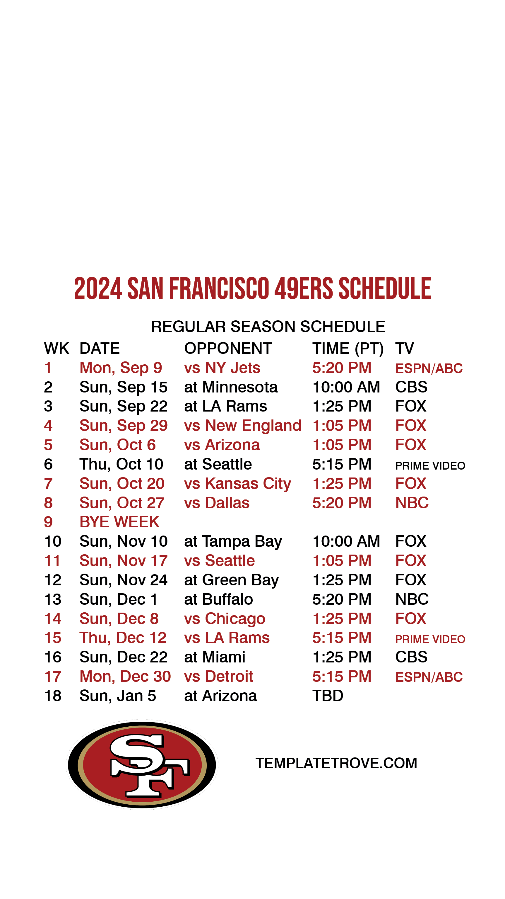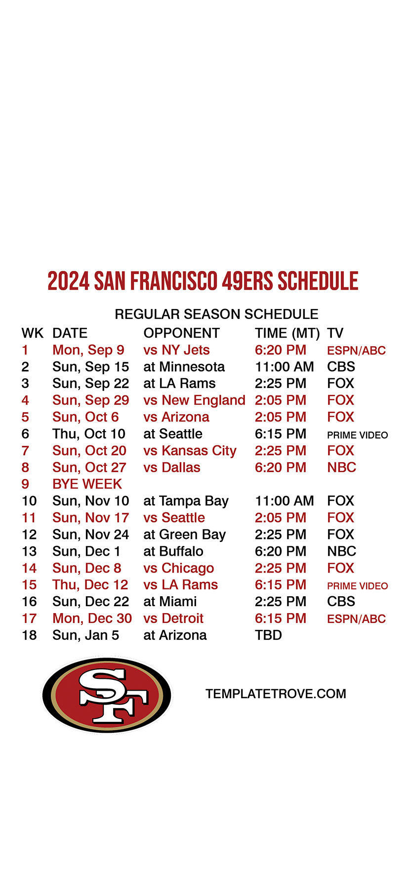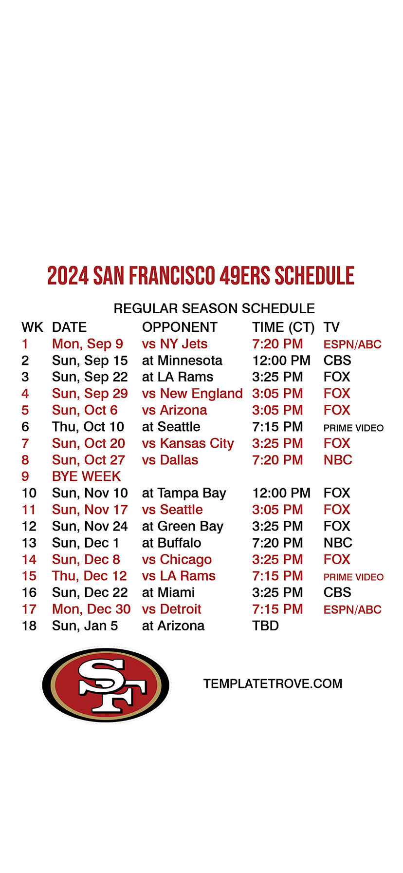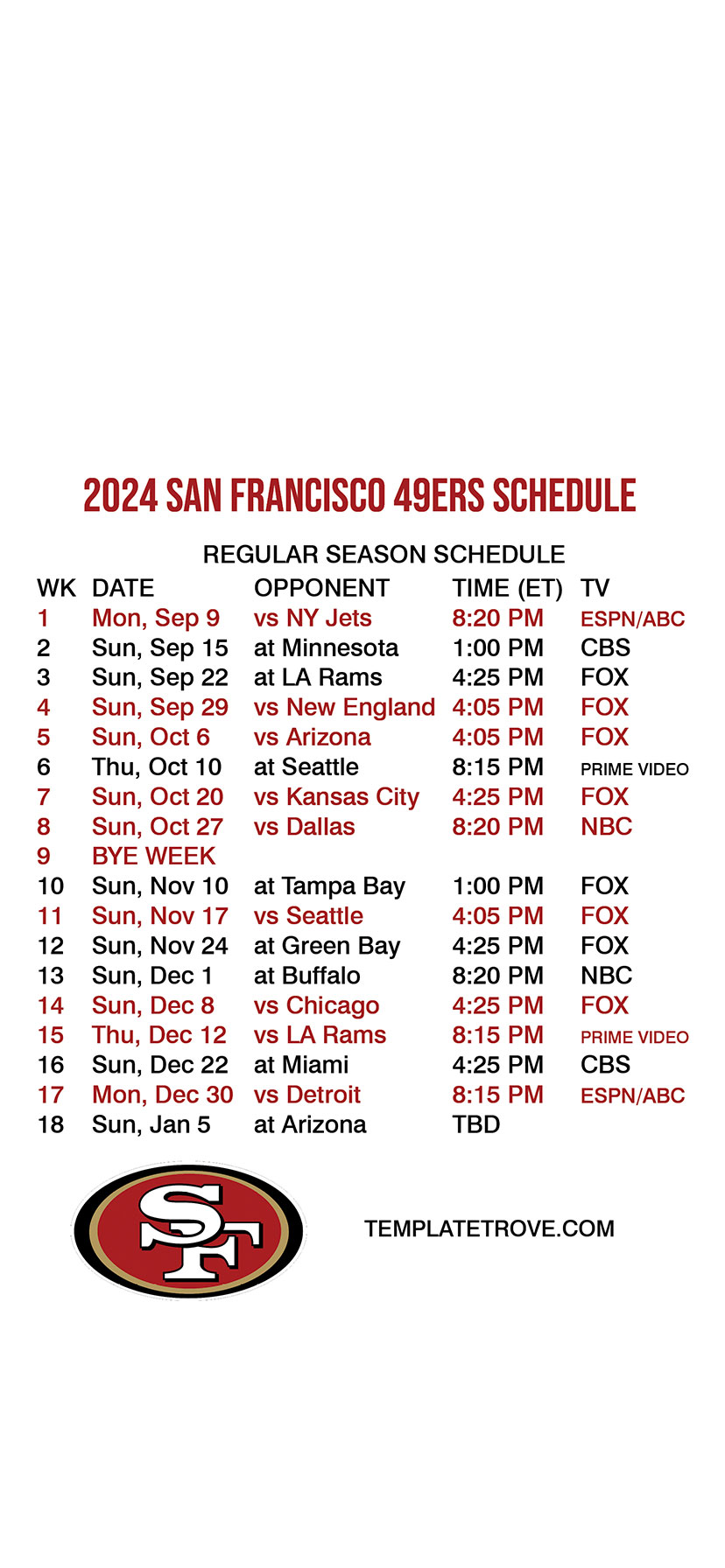 2024-25 San Francisco 49ers Lock Screen Schedule