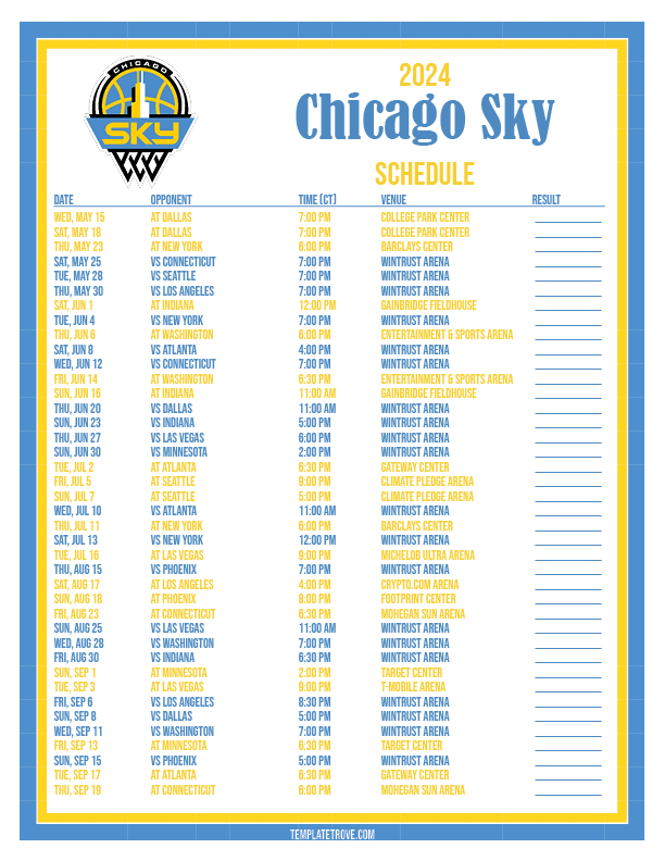 Keep up with the Chicago Sky basketball team in the 2024 season with our free printable regular season schedules.