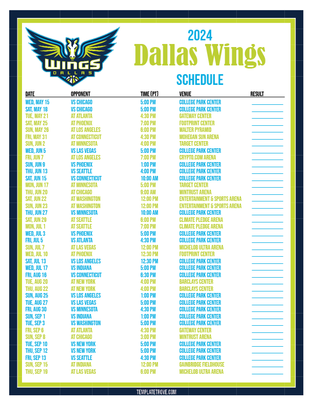 Keep up with the Dallas Wings basketball team in the 2024 season with our free printable regular season schedules.