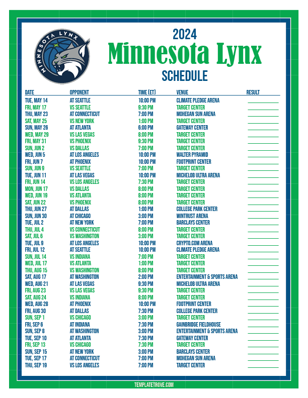Keep up with the Minnesota Lynx basketball team in the 2024 season with our free printable regular season schedules.