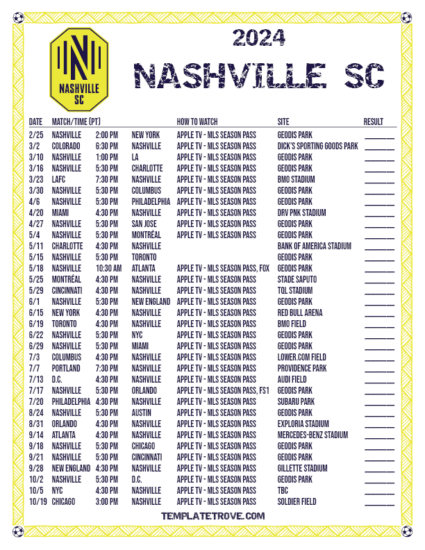 Keep up with the Nashville SC soccer team in the 2024 season with our free printable regular season schedules.