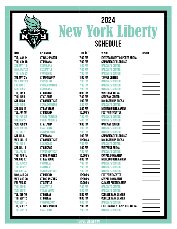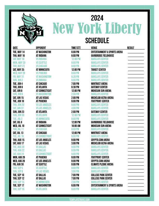 Keep up with the New York Liberty basketball team in the 2024 season with our free printable regular season schedules.