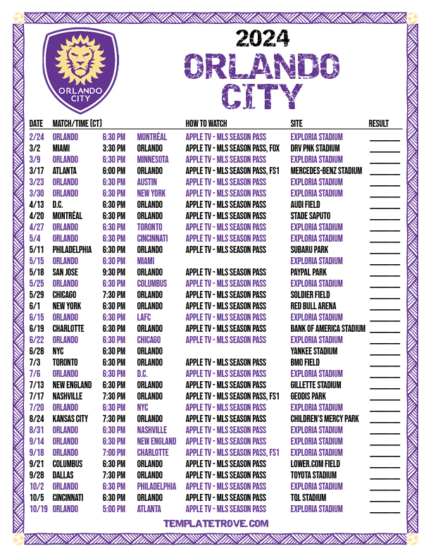 Keep up with the Orlando City soccer team in the 2024 season with our free printable regular season schedules.