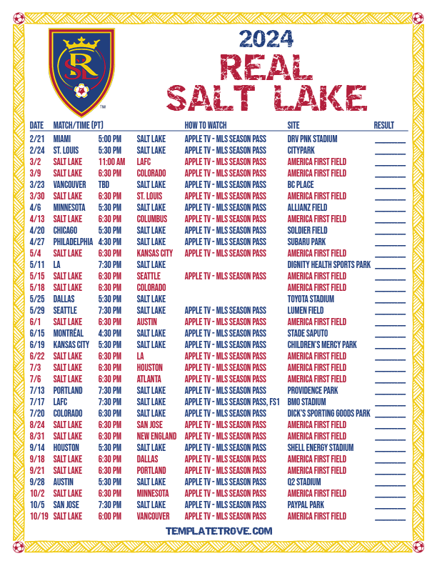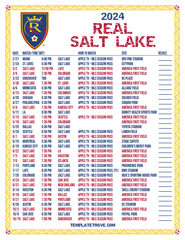Keep up with the Real Salt Lake soccer team in the 2024 season with our free printable regular season schedules.
