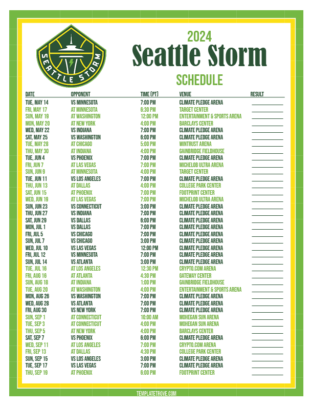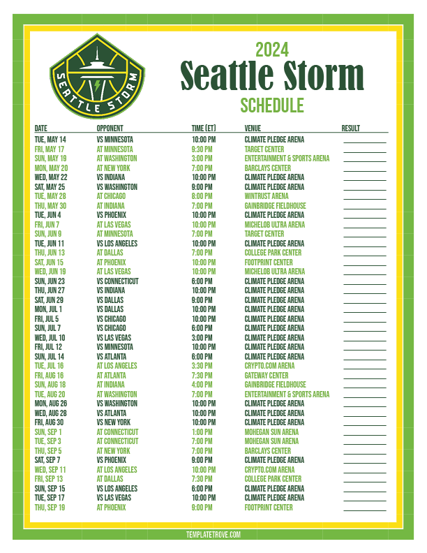 Keep up with the Seattle Storm basketball team in the 2024 season with our free printable regular season schedules.