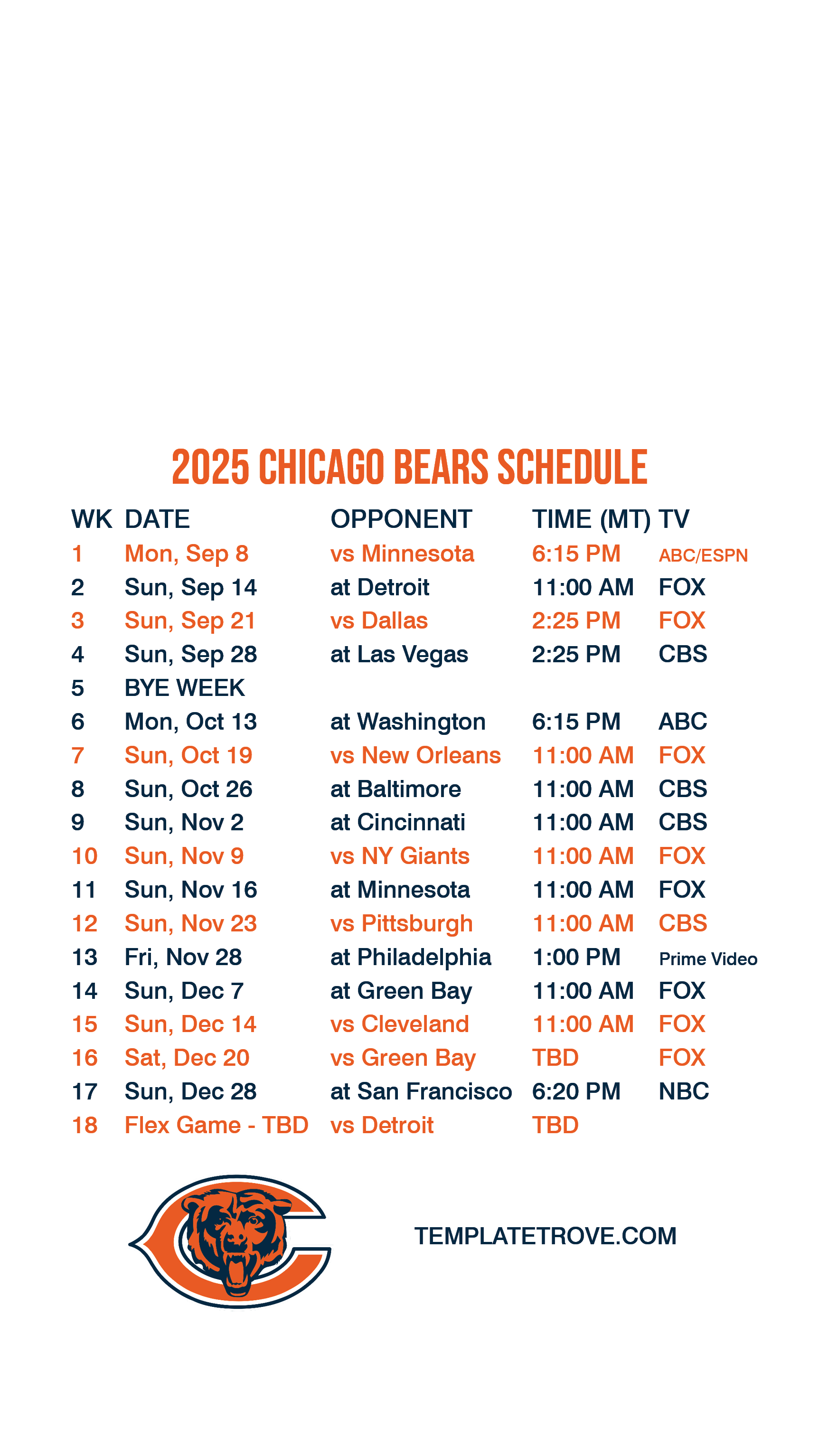 Chicago Bears Lock Screen Schedule for iPhone 6, 7, 8 Plus