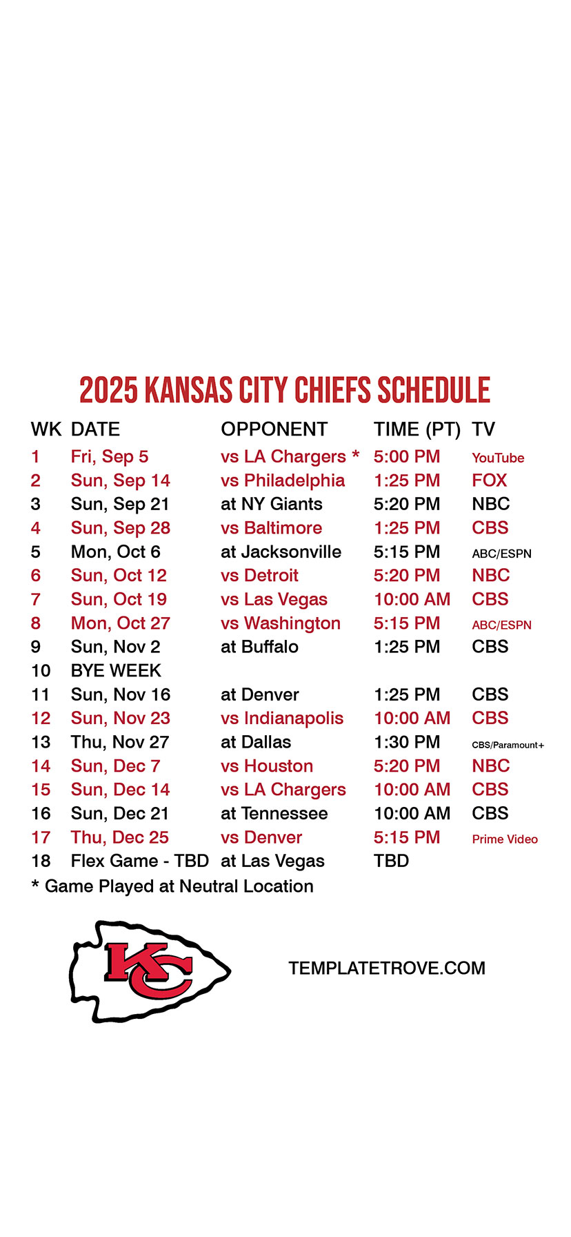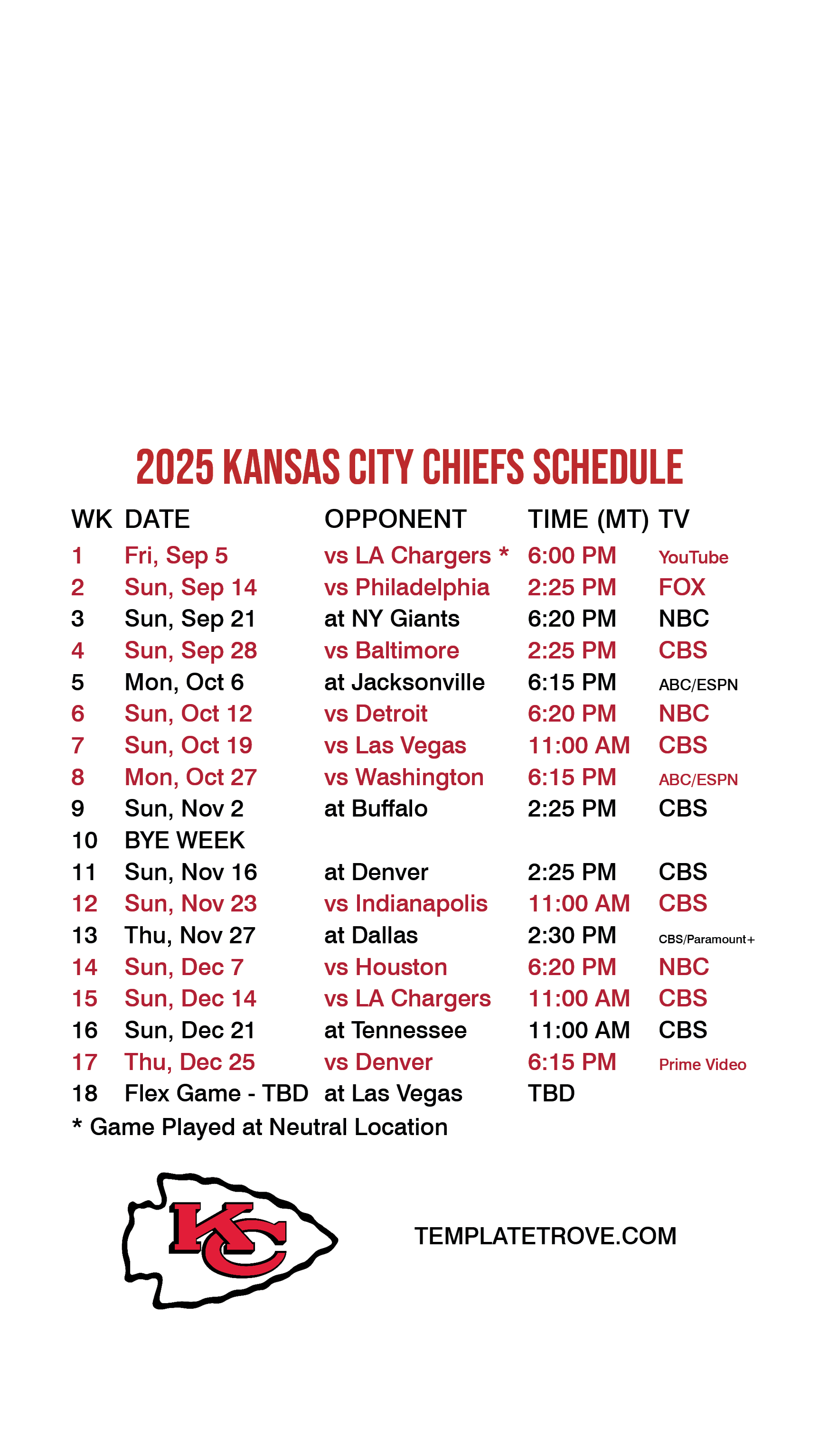 Kansas City Chiefs Lock Screen Schedule for iPhone 6, 7, 8