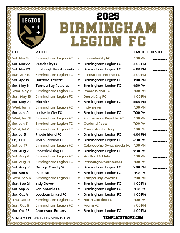Keep up with the Birmingham Legion FC soccer team in the 2025 season with our free printable regular season schedules.
