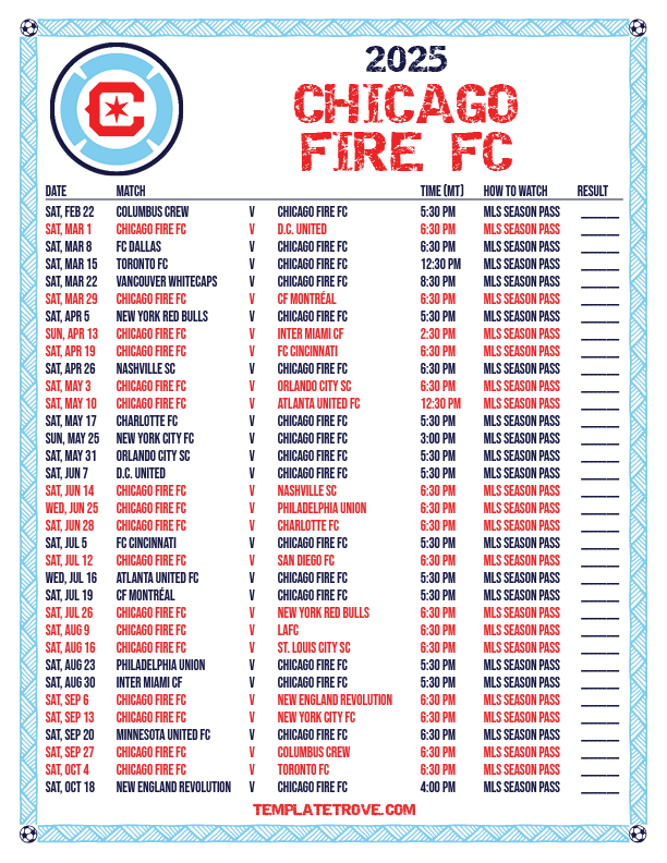 Keep up with the Chicago Fire FC soccer team in the 2025 season with our free printable regular season schedules.