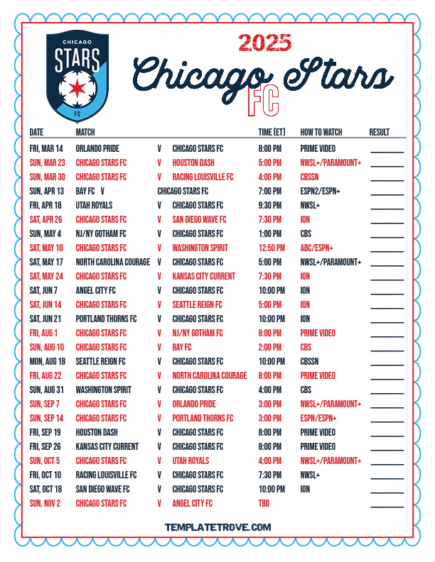 Keep up with the Chicago Stars FC soccer team in the 2025 season with our free printable regular season NWSL schedules.