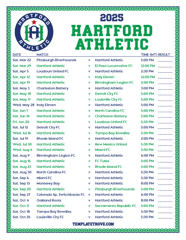 Keep up with the Hartford Athletic soccer team in the 2025 season with our free printable regular season schedules.