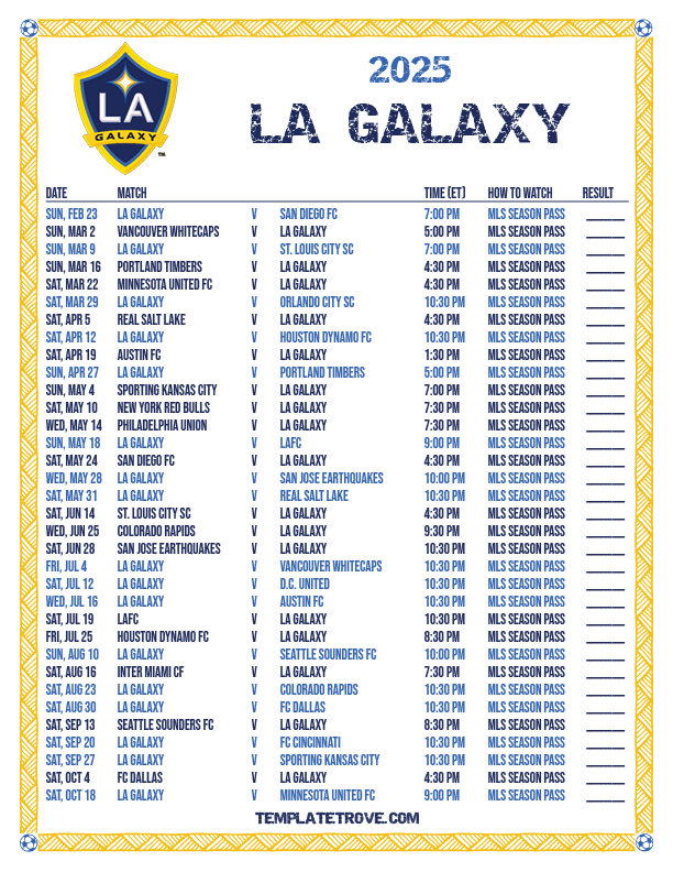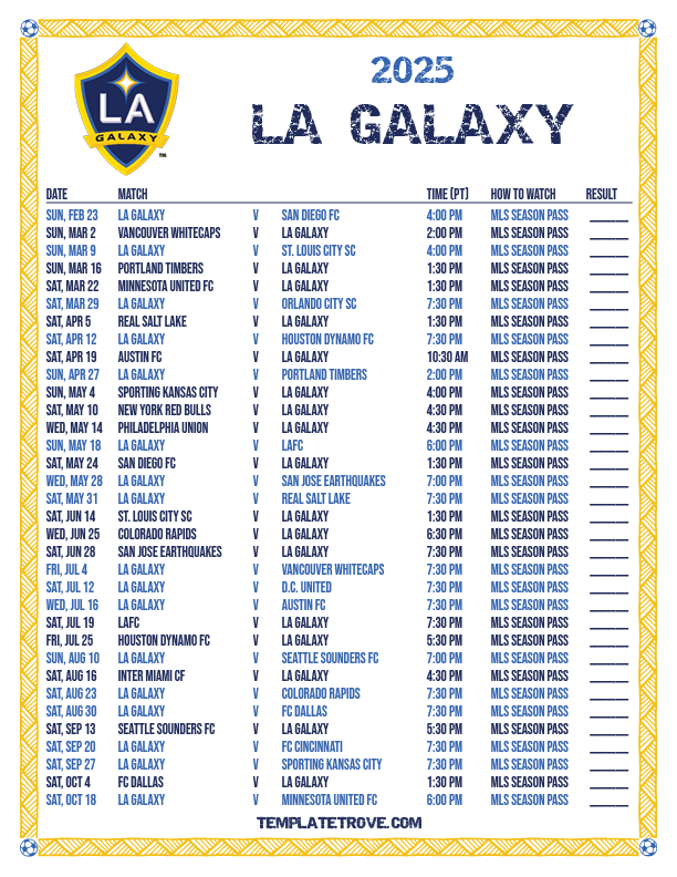 Keep up with the LA Galaxy soccer team in the 2025 season with our free printable regular season schedules.