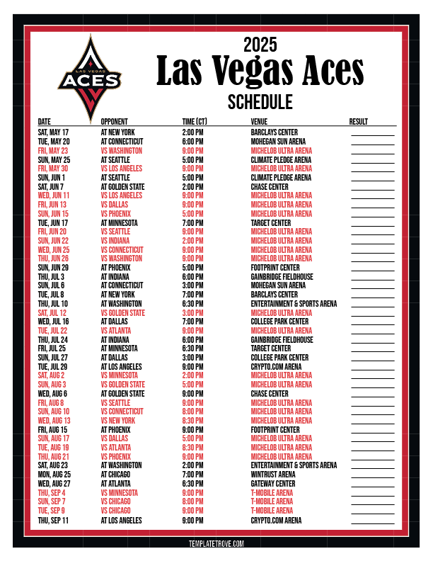 Keep up with the Las Vegas Aces basketball team in the 2025 season with our free printable regular season schedules.