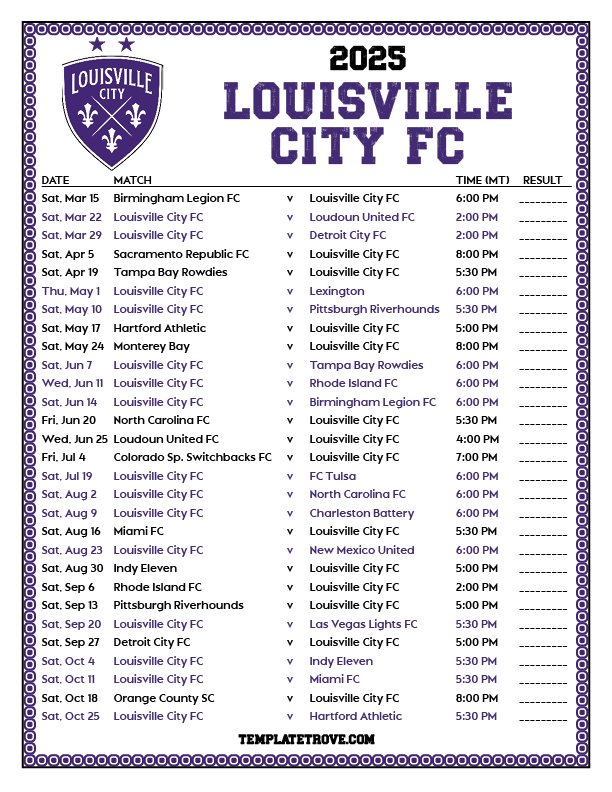 Keep up with the Louisville City FC soccer team in the 2025 season with our free printable regular season schedules.