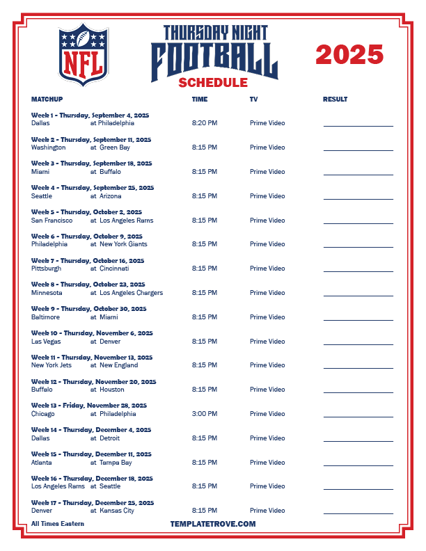 If Thursday nights are all about football for you, then our free printable Thursday Night Football schedule is a must-have! This easy-to-use printable includes all the matchups for the season, game times, and the channels where each game will be broadcast, so you’ll always know who’s playing and when to tune in. It’s a great tool for planning your week around kickoff or just keeping track of your favorite teams under the lights.