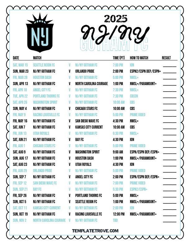 Keep up with the NJ-NY Gotham FC soccer team in the 2025 season with our free printable regular season NWSL schedules.