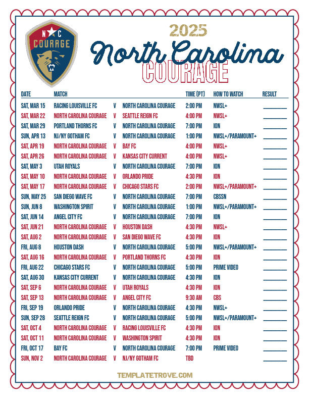 Keep up with the North Carolina Courage soccer team in the 2025 season with our free printable regular season NWSL schedules.