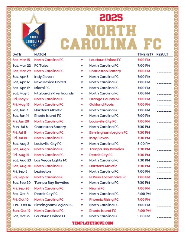 Keep up with the North Carolina FC soccer team in the 2025 season with our free printable regular season schedules.