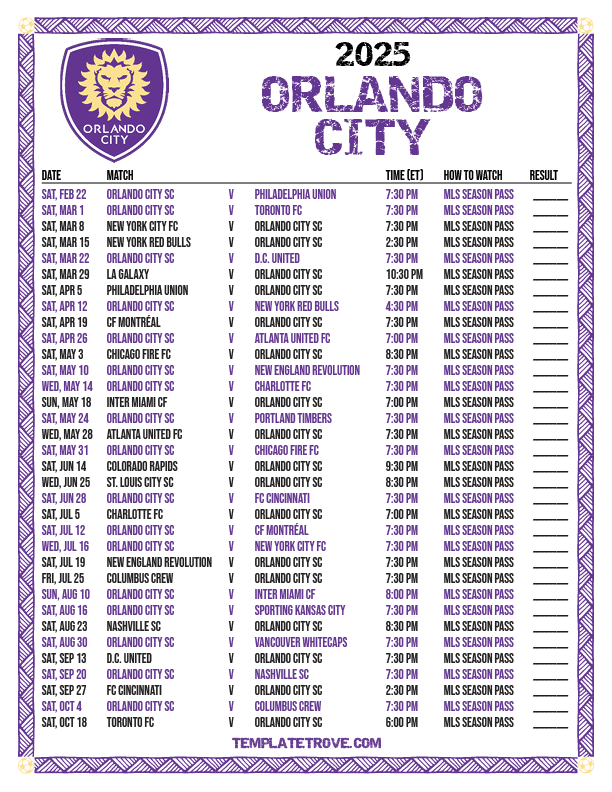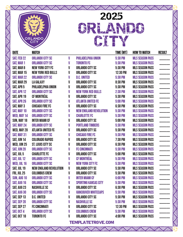Keep up with the Orlando City soccer team in the 2025 season with our free printable regular season schedules.