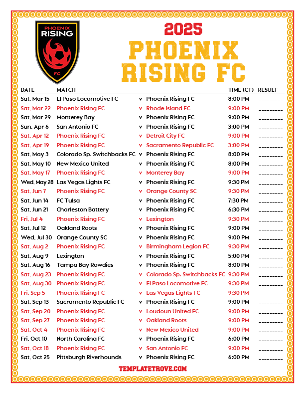 Keep up with the Phoenix Rising FC soccer team in the 2025 season with our free printable regular season schedules.
