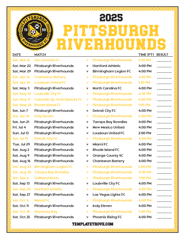 Keep up with the Pittsburgh Riverhounds soccer team in the 2025 season with our free printable regular season schedules.