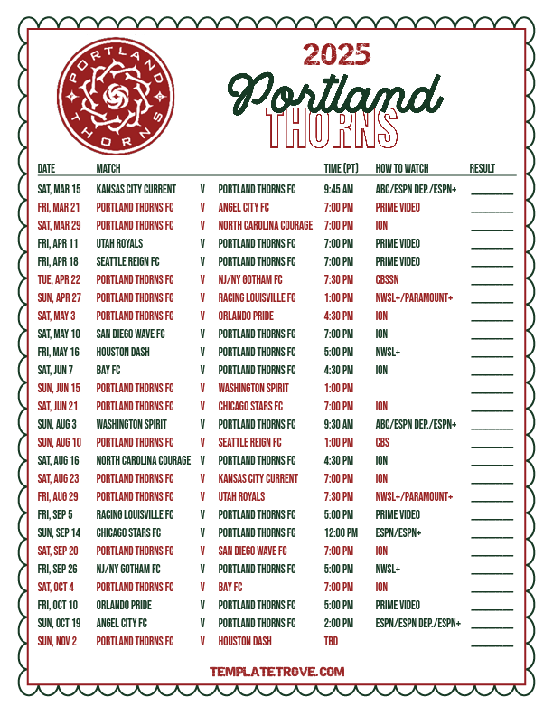 Keep up with the Portland Thorns FC soccer team in the 2025 season with our free printable regular season NWSL schedules.