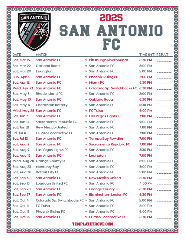 Keep up with the San Antonio FC soccer team in the 2025 season with our free printable regular season schedules.