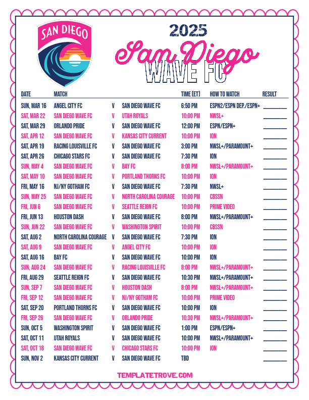 Keep up with the San Diego Wave FC soccer team in the 2025 season with our free printable regular season NWSL schedules.