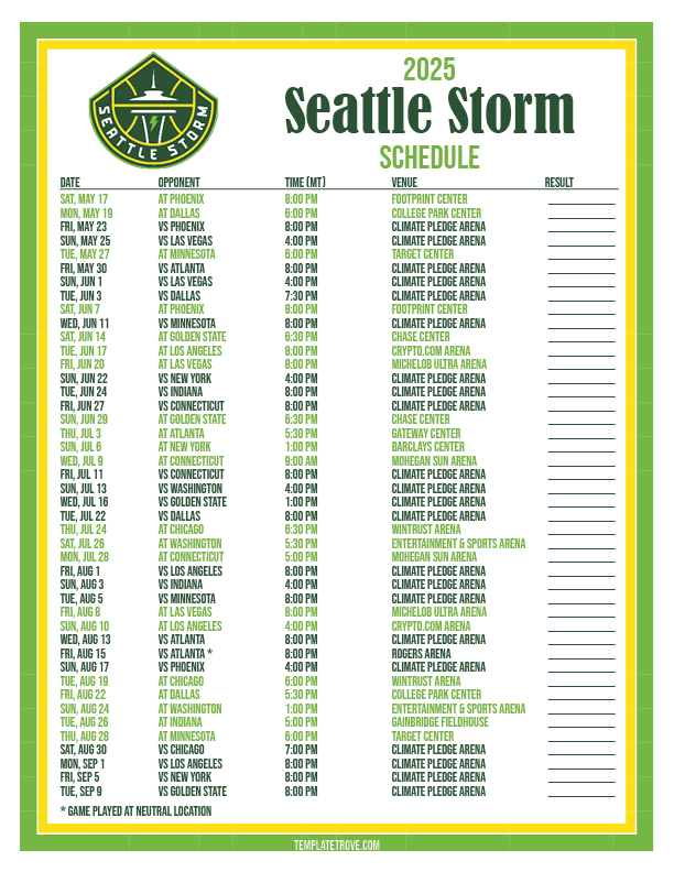 Keep up with the Seattle Storm basketball team in the 2025 season with our free printable regular season schedules.