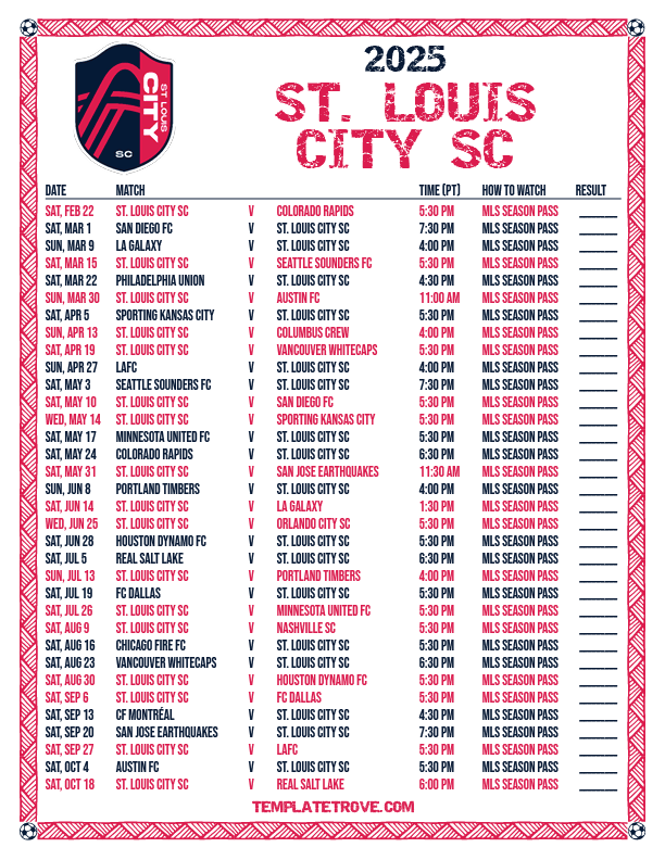 Keep up with the St Louis City SC soccer team in the 2025 season with our free printable regular season schedules.