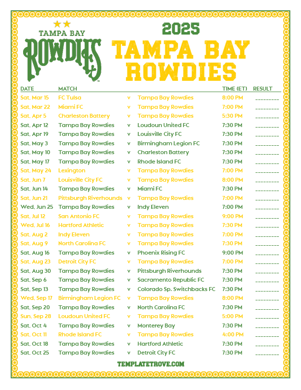 Keep up with the Tampa Bay Rowdies soccer team in the 2025 season with our free printable regular season schedules.