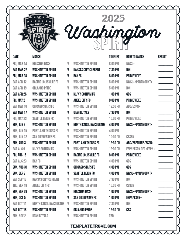 Keep up with the Washington Spirit soccer team in the 2025 season with our free printable regular season NWSL schedules.