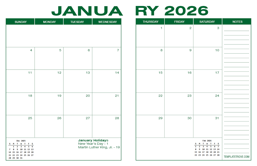 This template prints on standard 8 1/2" x 11" letter size paper and requires two pages for a complete month. The PDF includes both pages for each calendar month.