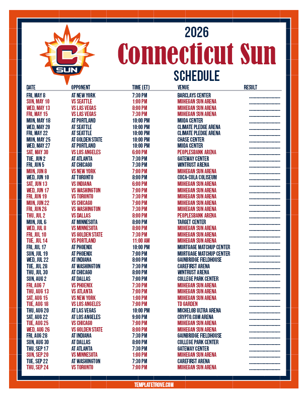 Keep up with the Connecticut Sun basketball team in the 2026 season with our free printable regular season schedules.