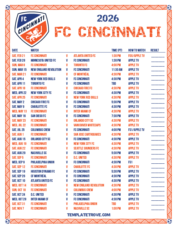 Keep up with the FC Cincinnati soccer team in the 2026 season with our free printable regular season schedules.