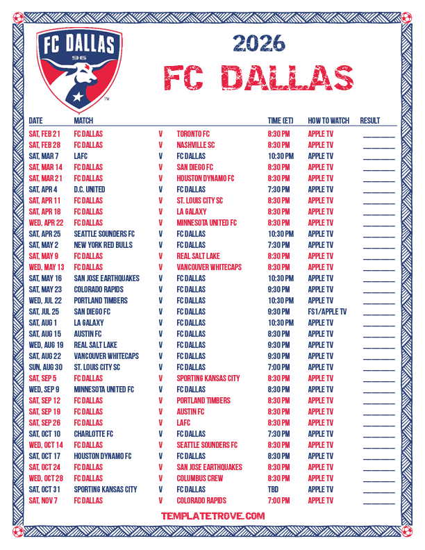 Keep up with the FC Dallas soccer team in the 2026 season with our free printable regular season schedules.