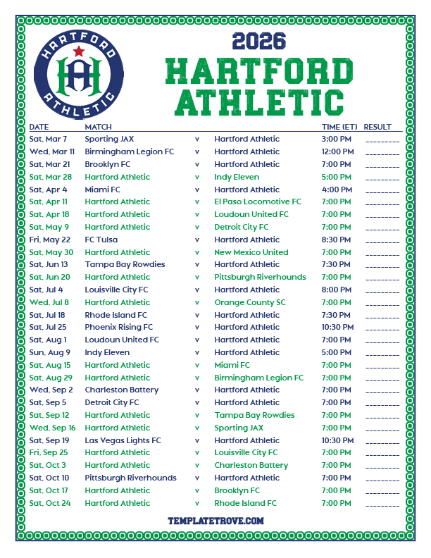 Keep up with the Hartford Athletic soccer team in the 2026 season with our free printable regular season schedules.