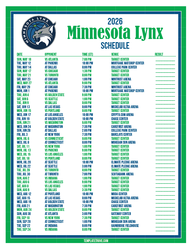 Keep up with the Minnesota Lynx basketball team in the 2026 season with our free printable regular season schedules.
