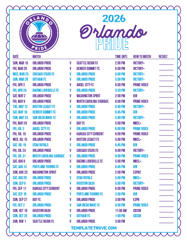 Keep up with the Orlando Pride soccer team in the 2026 season with our free printable regular season NWSL schedules.