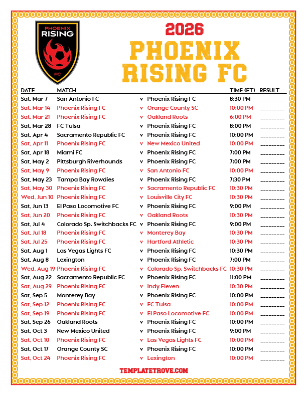 Keep up with the Phoenix Rising FC soccer team in the 2026 season with our free printable regular season schedules.