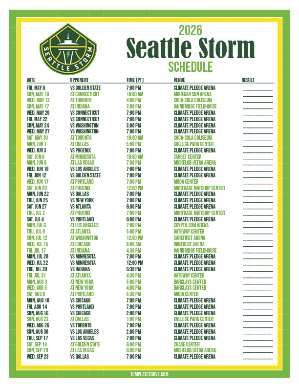 Keep up with the Seattle Storm basketball team in the 2026 season with our free printable regular season schedules.