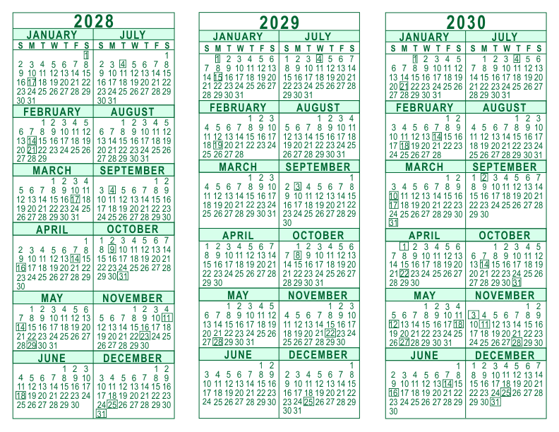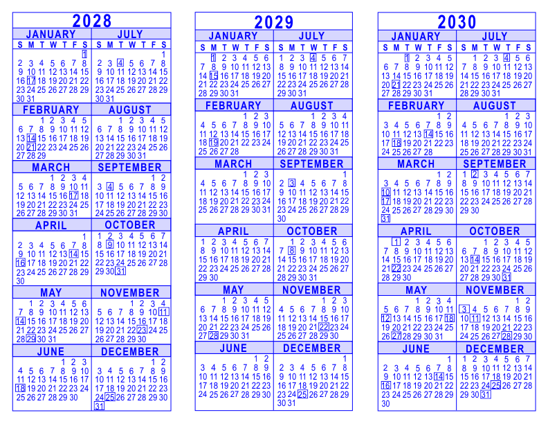 3 Year Calendar - 2028 through 2030