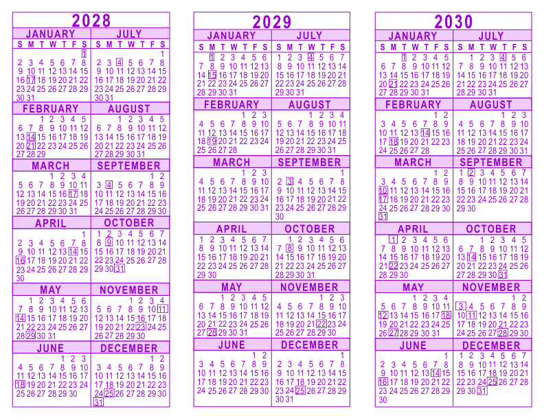 Purple 3 Year Calendar - 2028 - 2029 - 2030