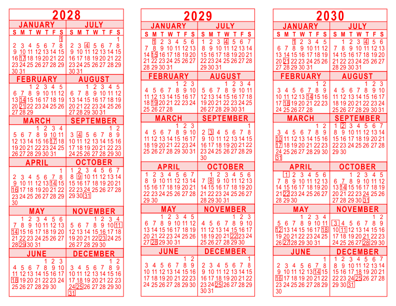 2028-29-30 3 Year Calendar - Red