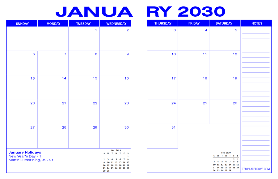 This template prints on standard 8 1/2" x 11" letter size paper and requires two pages for a complete month. The PDF includes both pages for each calendar month.