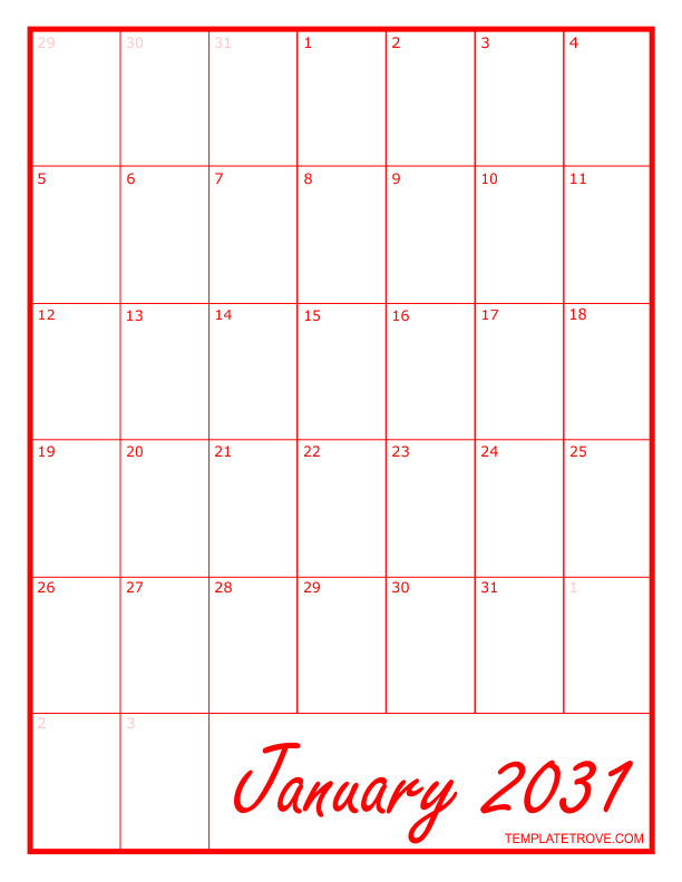 2031 Blank Monthly Calendar - Red