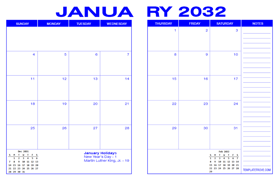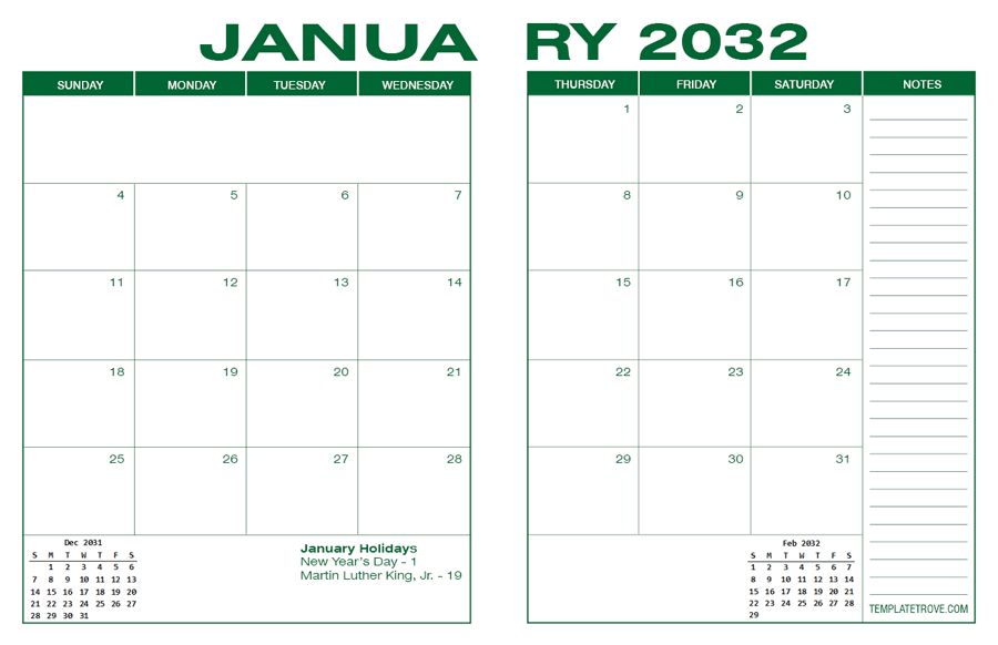 This template prints on standard 8 1/2" x 11" letter size paper and requires two pages for a complete month. The PDF includes both pages for each calendar month.