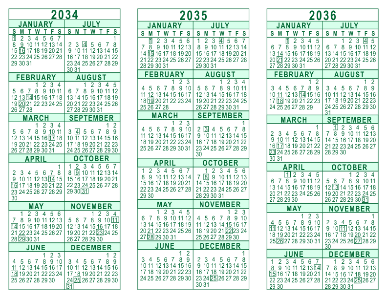 Blue 3 Year Calendar - 2034 - 2035 - 2036