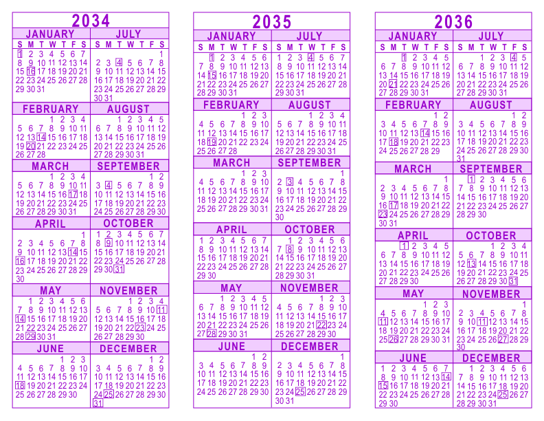 Purple 3 Year Calendar - 2034 - 2035 - 2036
