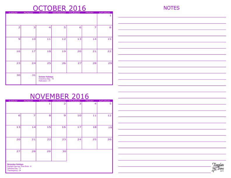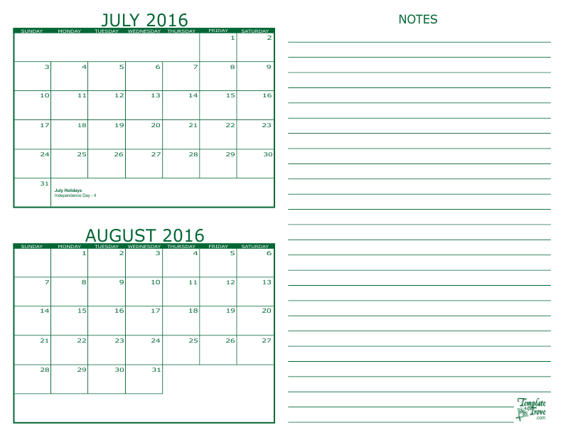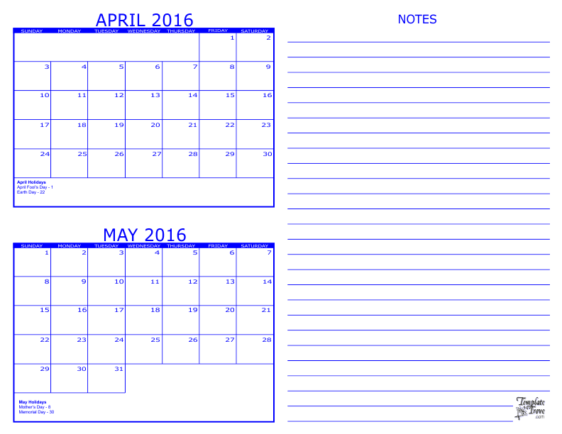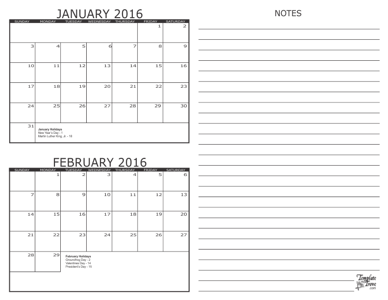 2 month calendars are available in PDF format. Five colors to choose from and can be printed on standard letter size paper (8 1/2" x 11") in landscape orientation. 2 calendar months on each page with a notes section for each month.